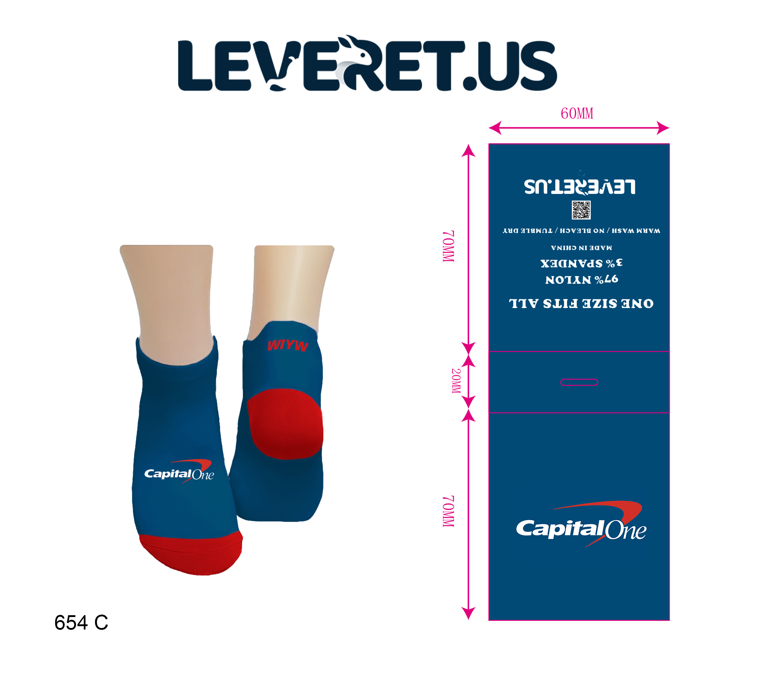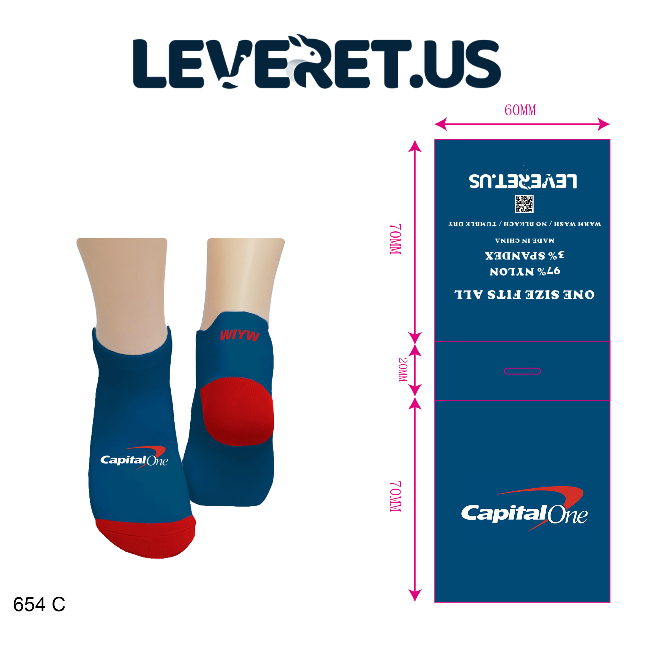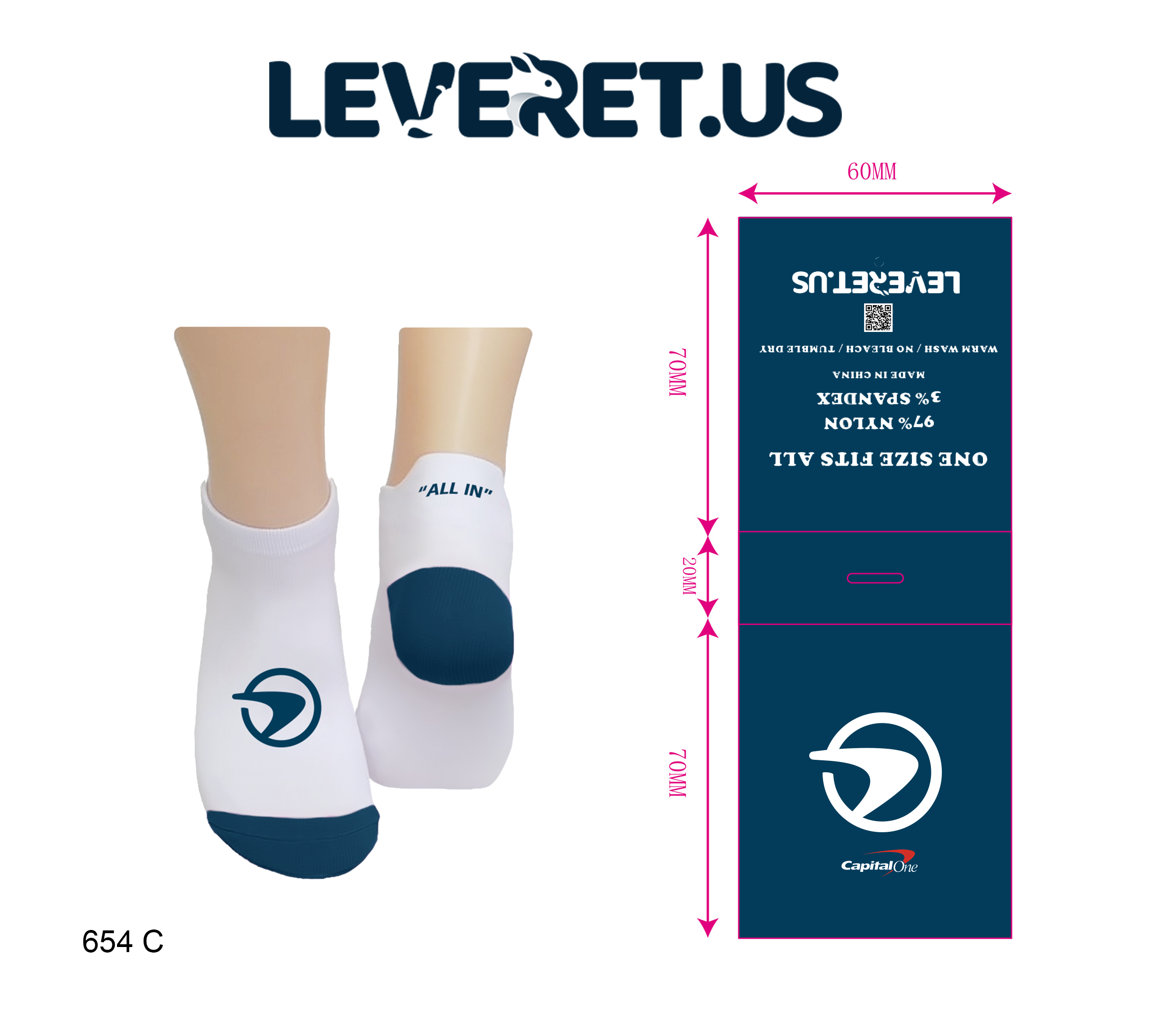 - Tailor your socks to match your brand colors & personal style: You may choose one color for the base and another for the heel and toe, plus the option to add your logo and a custom text on the back heel.