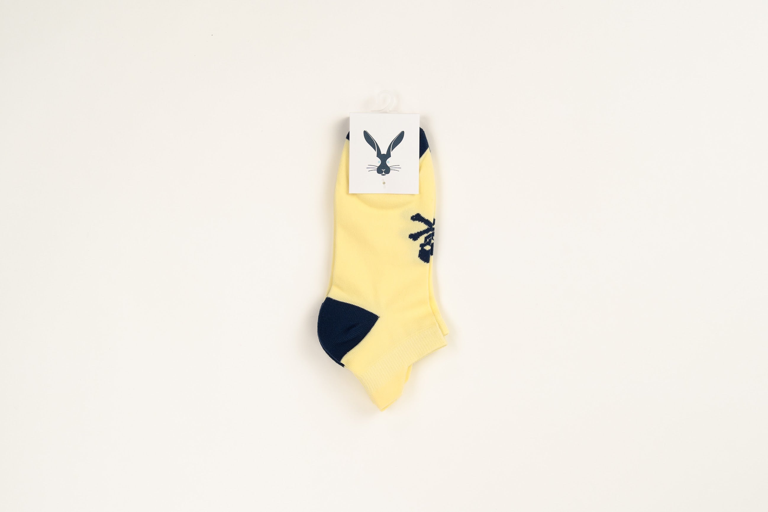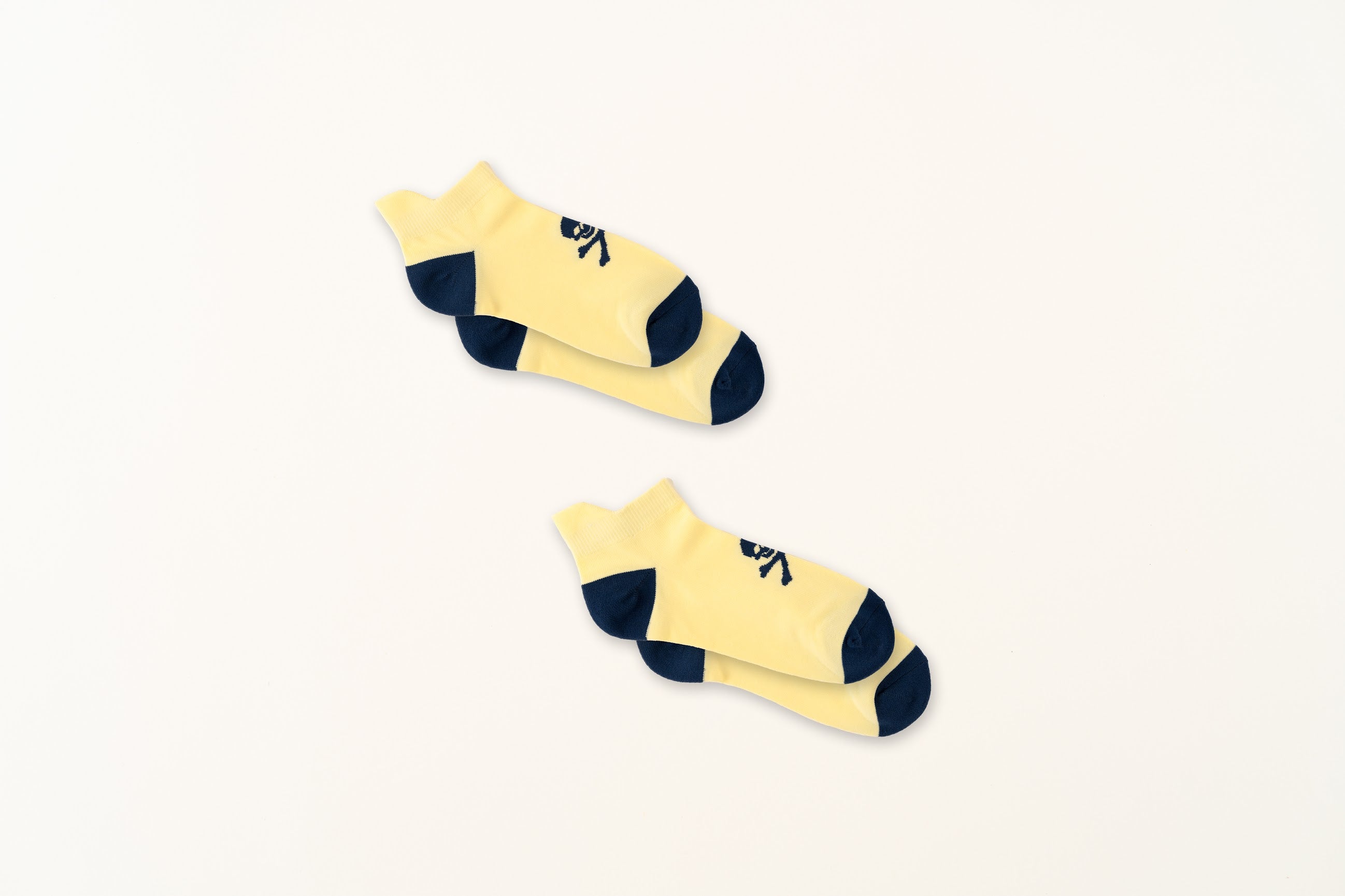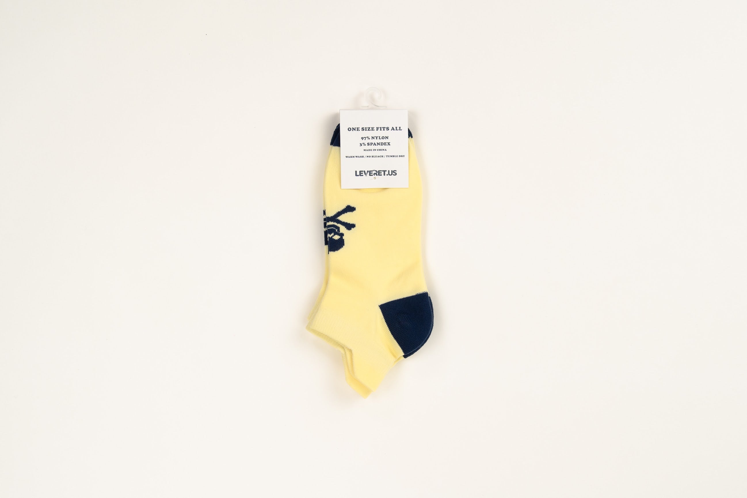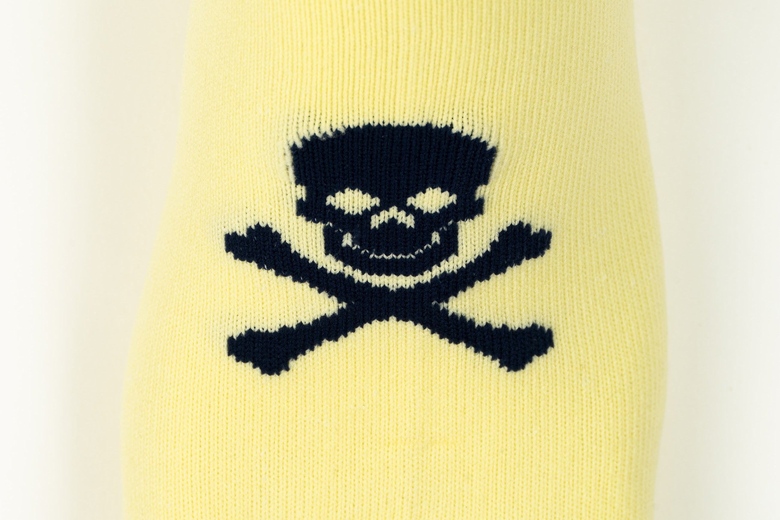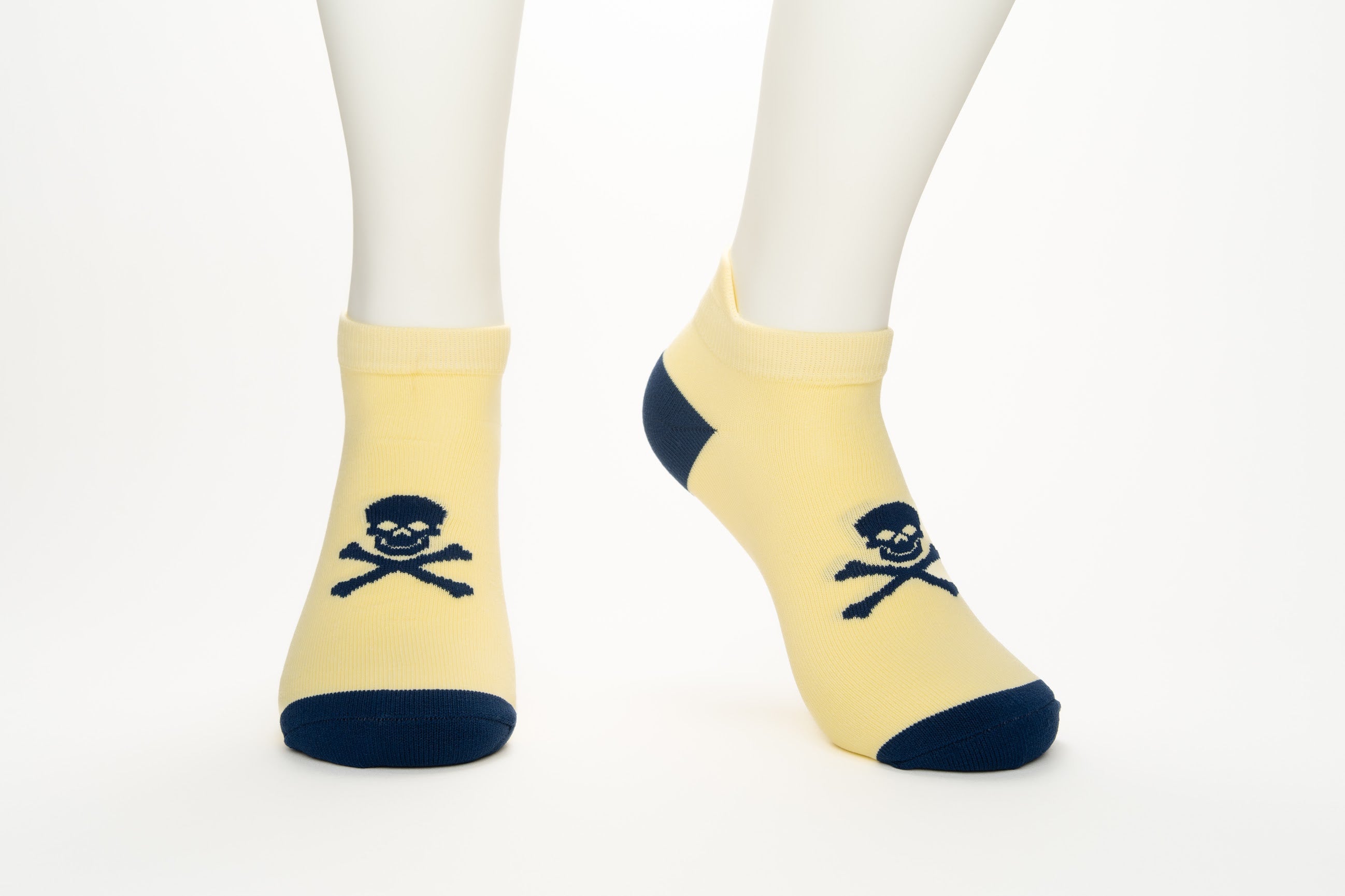 Add a bold edge to your golf game with Leveret’s Butterskull + Crossbones socks. This daring set features two pairs of golf socks in a buttery yellow and sleek black, with alternating colors on the toes and heels, and a striking skull-and-crossbones symbol.